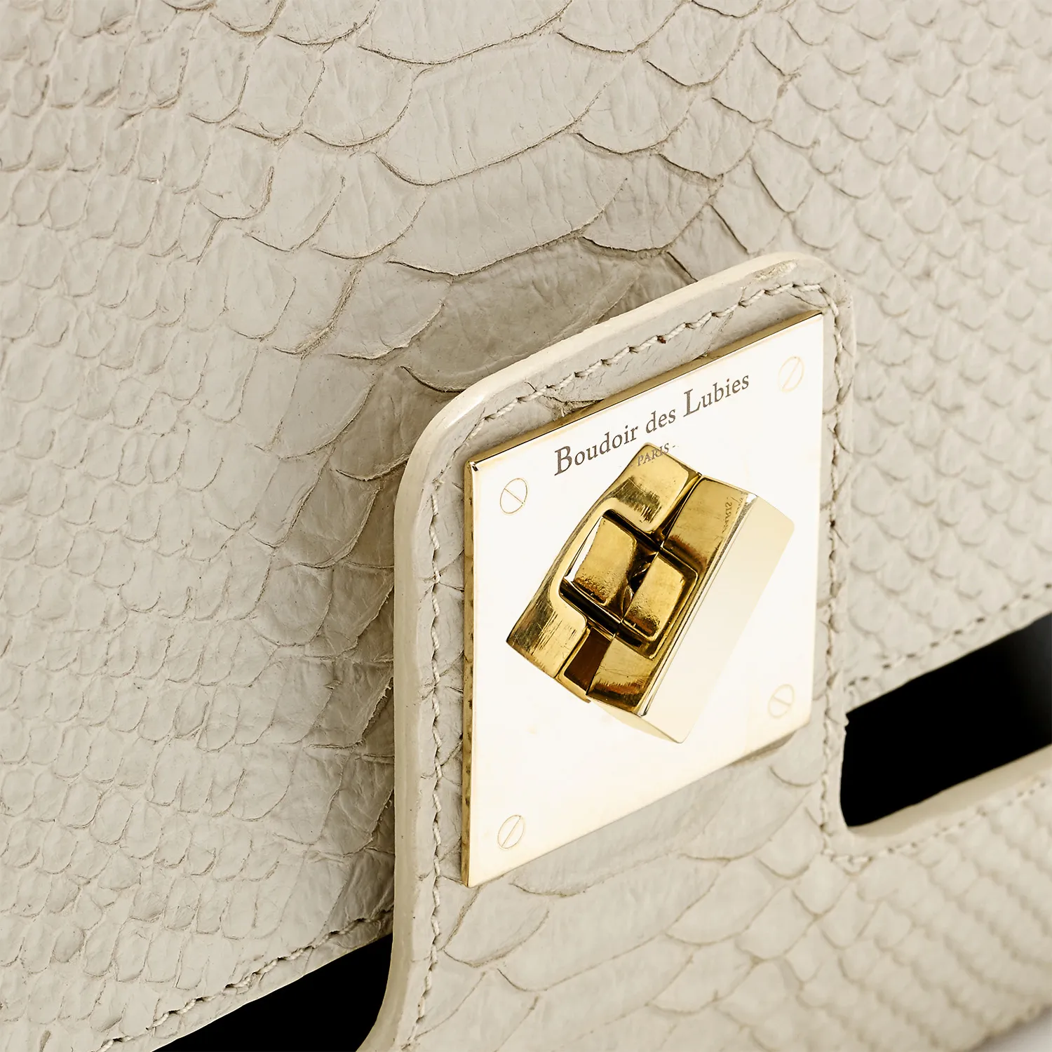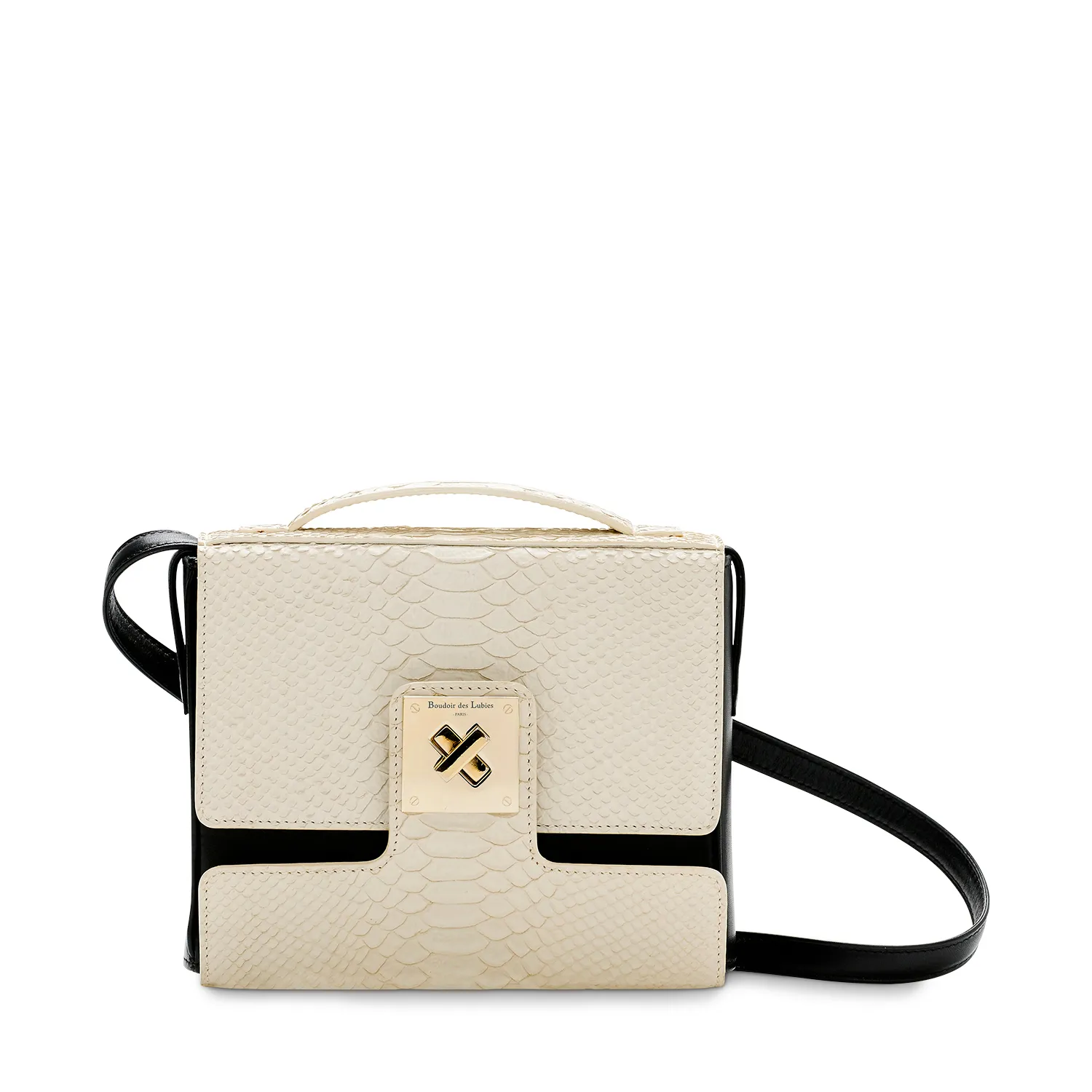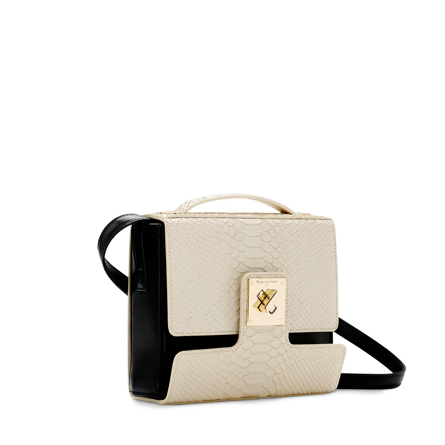 Confectionné en cuir de veau haut de gamme, il se distingue par son rabat décliné en cuir lisse noir ou en cobra ivoire. Les finitions métal doré clair apportent une touche de lumière discrète, tandis que la doublure en tissu assure confort et durabilité.